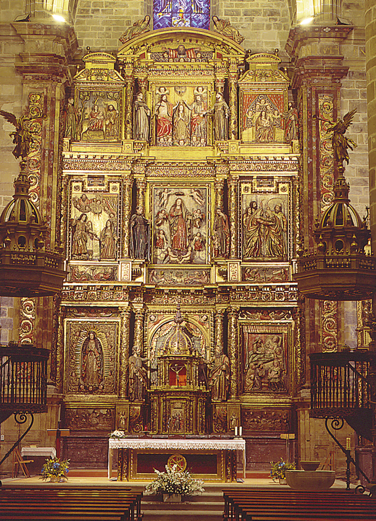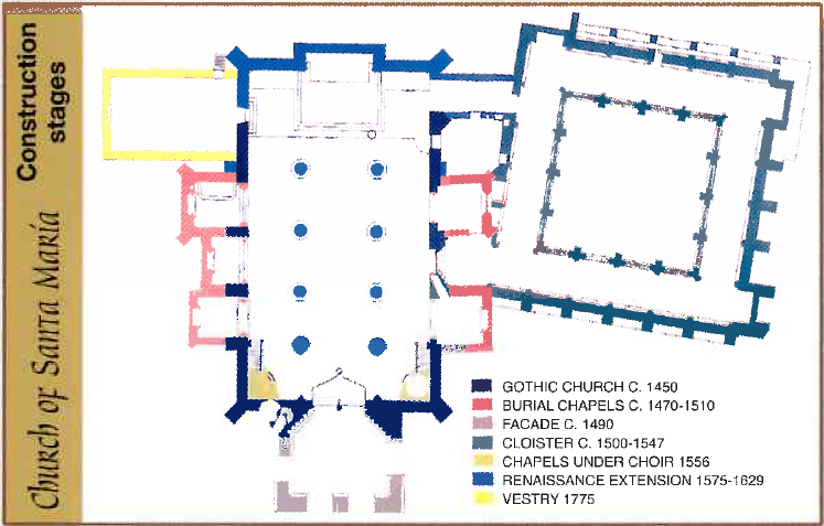 In the 15th century, reconstruction was begun on top of the foundations of the original 14th century church. It was extended in the 16th century and finished in the 17th century. From the Gothic period, the church conserves the facade, the side chapels, the cloister, and a small part of the triforium. Between 1575 and 1629 the church was augmented in a traditional renaissance style. This work coincided with the defeat of the Invincible Navy (1588), a fact that led to the decline of the wool trade and, consequently, the delay in the augmentation of the church.