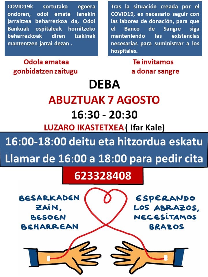 Donación de sangre Es necesario pedir cita previa https://www.deba.eus/api/es/actualidad/agenda/donacion-de-sangre-5 https://www.deba.eus/api/++resource++plone-logo.svg Donación de sangre Es necesario pedir cita previa https://www.deba.eus/api/es/actualidad/agenda/donacion-de-sangre-5 Donación de sangre 2020-08-07T16:30:00+02:00 2020-08-07T20:30:00+02:00 Es necesario pedir cita previa Cuándo 07/08/2020 16:30-20:30 (Etc/GMT-2 / UTC200) Dónde Colegio Luzaro (Ifar kalea) Nombre del Contacto Debako Odol Emaile Elkartea Teléfono de contacto 623328408 Agregar evento al calendario iCal