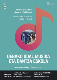 El plazo de inscripción para el curso 2022-2023 en Debako Udal Musika eta Dantza Eskola está abierto hasta el 17 de junio. El Horario de oficina es de lunes a jueves de 14:00 a 19:00 horas y los viernes de 10:00 a 15:00 horas.