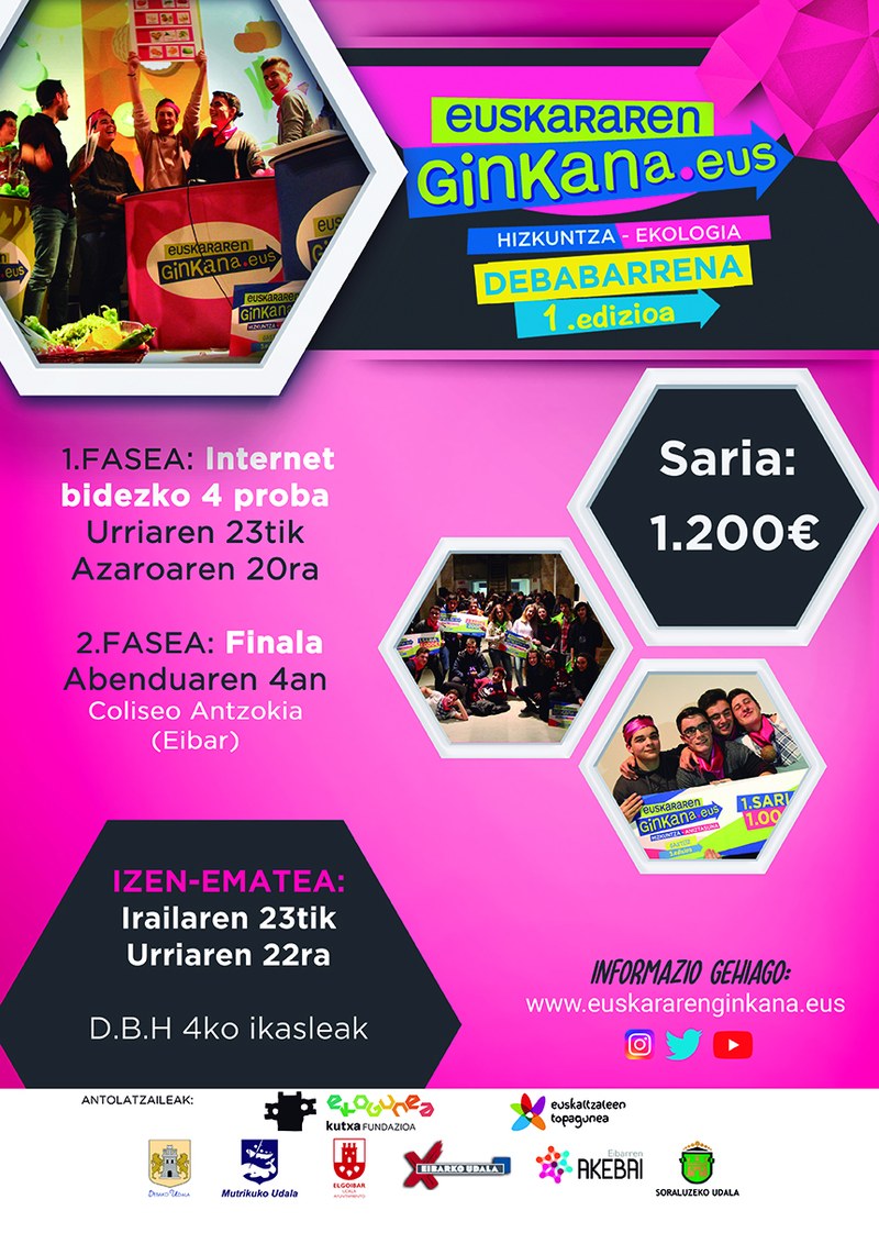 Se va a celebrar la primera edición de la Ginkana del Euskara de Debabarrena. La Ginkana del Euskara de Kutxa Ekogunea, es un concurso para divertirse con el euskara en euskara, concurso que se realiza en grupos y entre pueblos. Los grupos participantes deberán realizar pruebas relacionadas con el euskara, la diversidad lingüística y la ecología lingüística. El tema de la edición de este año es la ecología lingüística.
