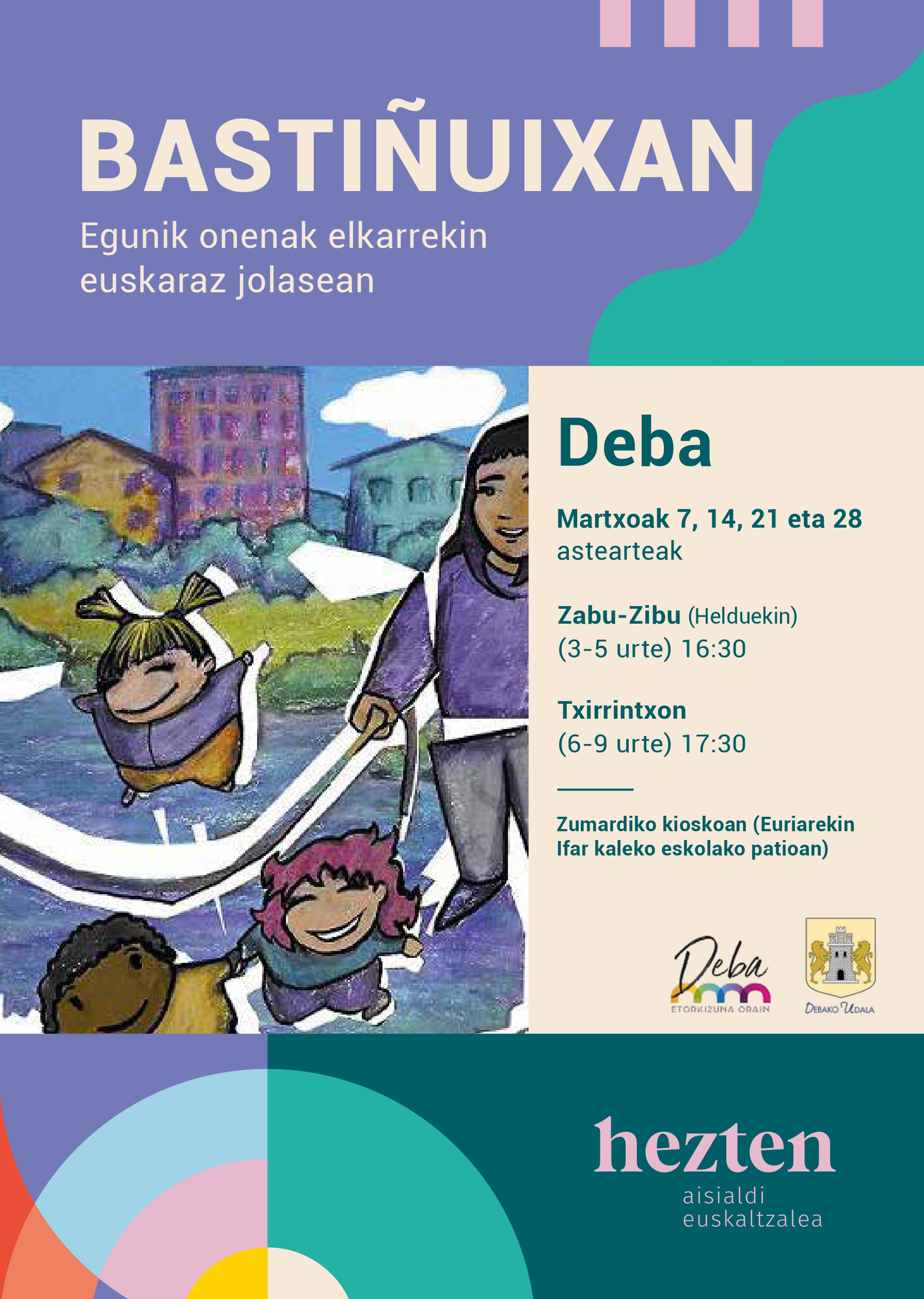 "plaintext": "Los d\u00edas 7, 14, 21 y 28 de marzo el Ayuntamiento de Deba y Hezten seguir\u00e1n con el programa Basti\u00f1uixan que tiene como objetivo aumentar el uso del euskera en los parques y en la calle. Contar\u00e1 con la ayuda de profesionales de Hezten, y se realizar\u00e1n juegos en el quiosco de la alameda (si llueve, en el patio del colegio de Ifar kalea)."