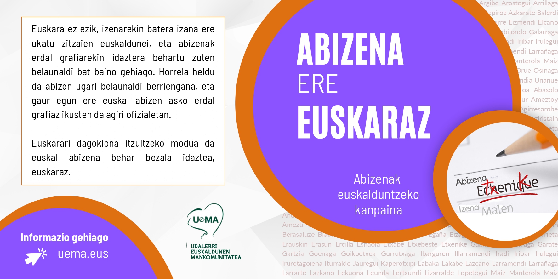 El Ayuntamiento de Deba lanza la campaña “euskaraz naiz” junto con UEMAEl objetivo es que la ciudadanía vasca escriba oficialmente sus apellidos en la grafía vasca correspondiente.https://www.deba.eus/api/es/actualidad/noticias/el-ayuntamiento-de-deba-lanza-la-campana-201ceuskaraz-naiz201d-junto-con-uemahttps://www.deba.eus/api/es/actualidad/noticias/el-ayuntamiento-de-deba-lanza-la-campana-201ceuskaraz-naiz201d-junto-con-uema/@@download/image/Abizenak 1.jpg