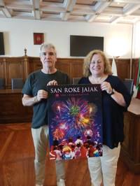 "plaintext": "Mediante su propuesta, el autor ha querido reflejar un elemento cl\u00e1sico y a su vez reconocido y emblem\u00e1tico de las fiestas municipales: los fuegos artificiales. De este modo, el cartel recoge a las y los distintos protagonistas de las fiestas disfrutando de dicho espect\u00e1culo pirot\u00e9cnico: gigantes, cabezudos, dantzaris, figuras de la tamborrada, marineras/os\u2026 ",