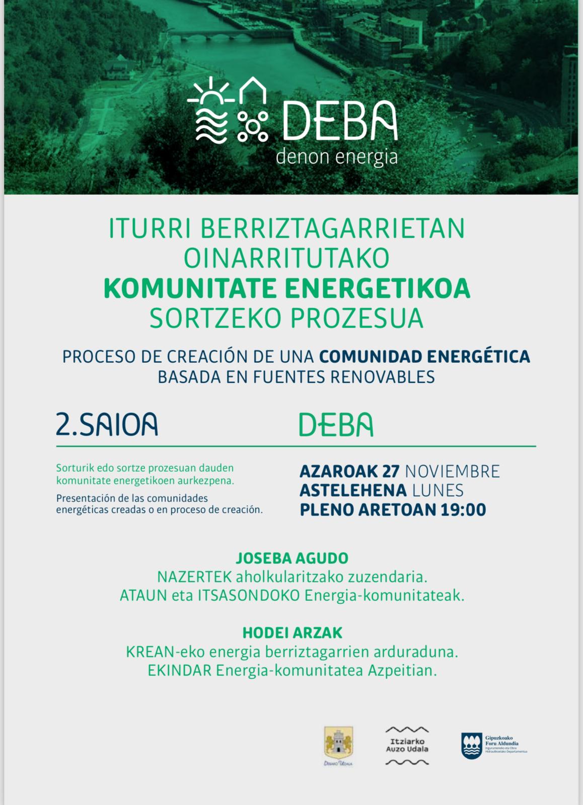 "plaintext": "El Ayuntamiento de Deba anuncia la pr\u00f3xima reuni\u00f3n informativa sobre el proceso de creaci\u00f3n de comunidades energ\u00e9ticas basadas en fuentes renovables. En esta segunda sesi\u00f3n, se presentar\u00e1n las comunidades energ\u00e9ticas ya creadas o en proceso de creaci\u00f3n en la regi\u00f3n."
