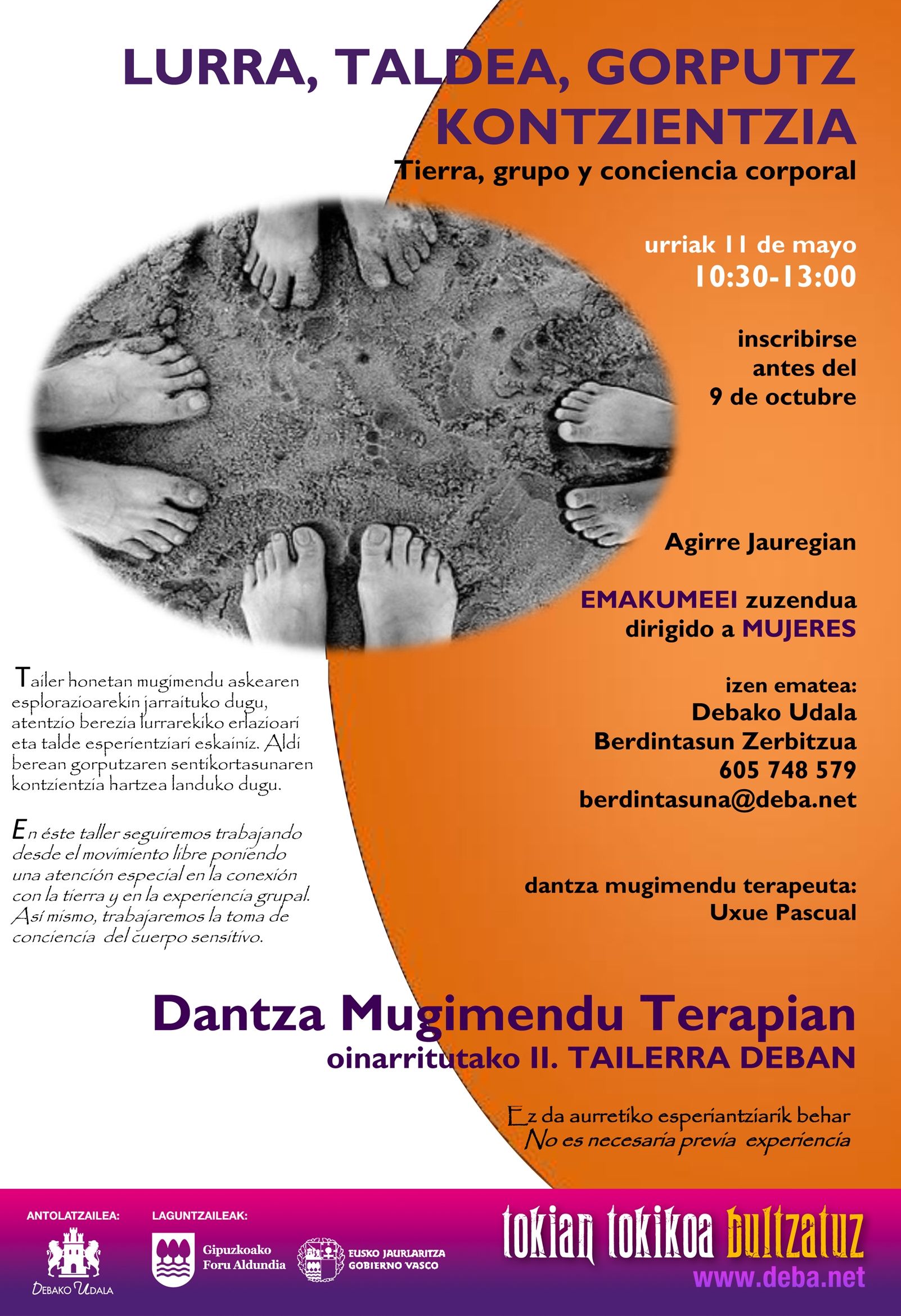 Dantza Mugimendu Terapian oinarritutako 2. tailerra emango du Uxue Pascual terapeutak datorren urriaren 11an. Emakumeei zuzendutako tailer honetan mugimendu askearen esplorazioarekin jarraituko da eta atentzio berezia eskainiko zaio lurrarekiko erlazioari eta talde esperientziari. Izen-ematea urriaren 9a baino lehen egin beharko da Debako Udaleko Berdintasun Zerbitzuan; telefonoz (605 748 579) edo emailez (berdintasuna@deba.net).