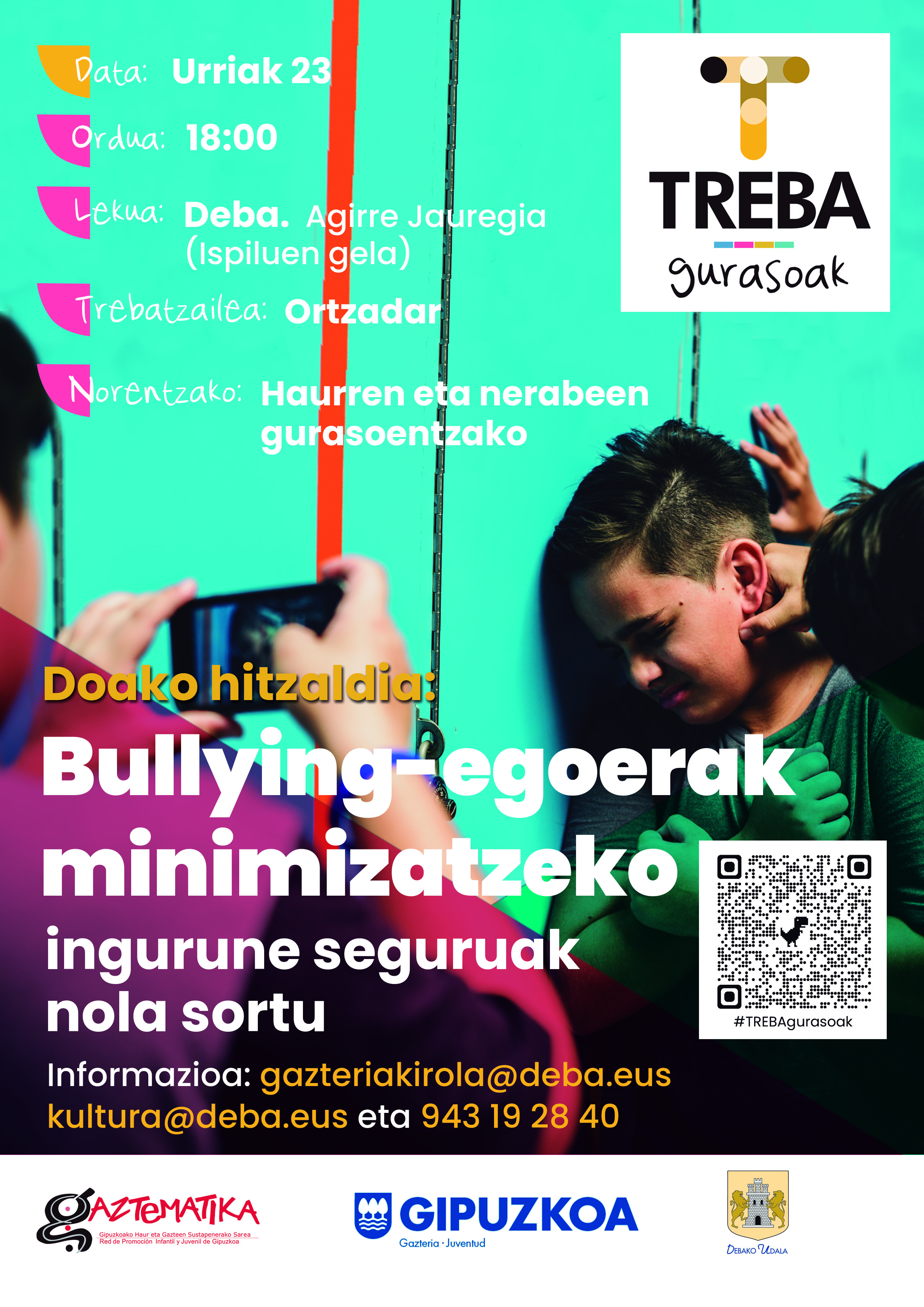 Debak "Bullying-egoerak minimizatzeko inguru seguruak nola sortu" hitzaldia hartuko du urriaren 23an, Treba Gurasoak programaren baitanHitzaldia arratsaldeko 18:00etan izango da, Ispiluen Gelan, eta bullying-a prebenitzeko eta haur eta nerabeentzako ingurune seguruak sustatzeko tresnak eskaintzea du helburu. Saioa haur eta nerabeen gurasoei zuzenduta dago. https://www.deba.eus/api/eu/aktualitatea/albisteak/debak-bullying-egoerak-minimizatzeko-inguru-seguruak-nola-sortu-hitzaldia-hartuko-du-urriaren-23an-treba-gurasoak-programaren-baitan-1https://www.deba.eus/api/eu/aktualitatea/albisteak/debak-bullying-egoerak-minimizatzeko-inguru-seguruak-nola-sortu-hitzaldia-hartuko-du-urriaren-23an-treba-gurasoak-programaren-baitan-1/@@download/image/BullyingDEBA.jpg