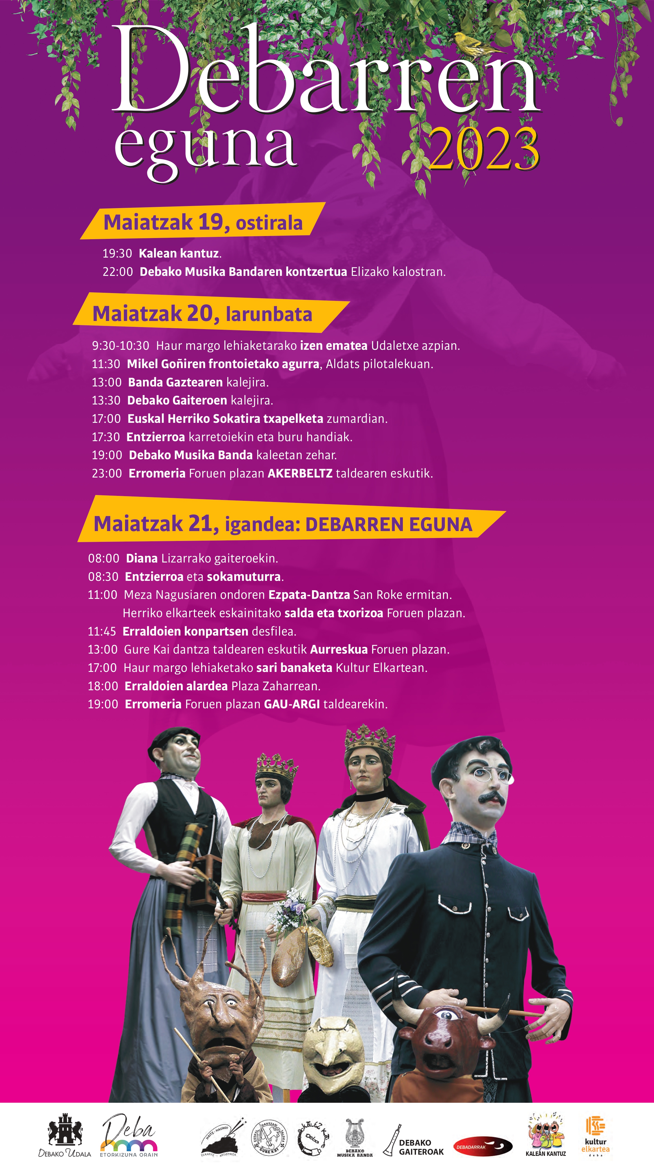 "text": "Maiatzaren 21a izango da Debarren egun handia. Goizeko 8:00etan, Lizarrako gaiteroekin herria esnatuko da. Ondoren, sokamuturra, meza nagusia, ezpata-dantza, Euskal Herriko txoko ezberdinetatik etorritako erraldoien konpartsen desfilea (guztira 20 erraldoi), Gure Kai dantza taldearen eskutik aurreskua, haur margo lehiaketako sari banaketa, erromeria Gau-argi taldearekin eta abar. "