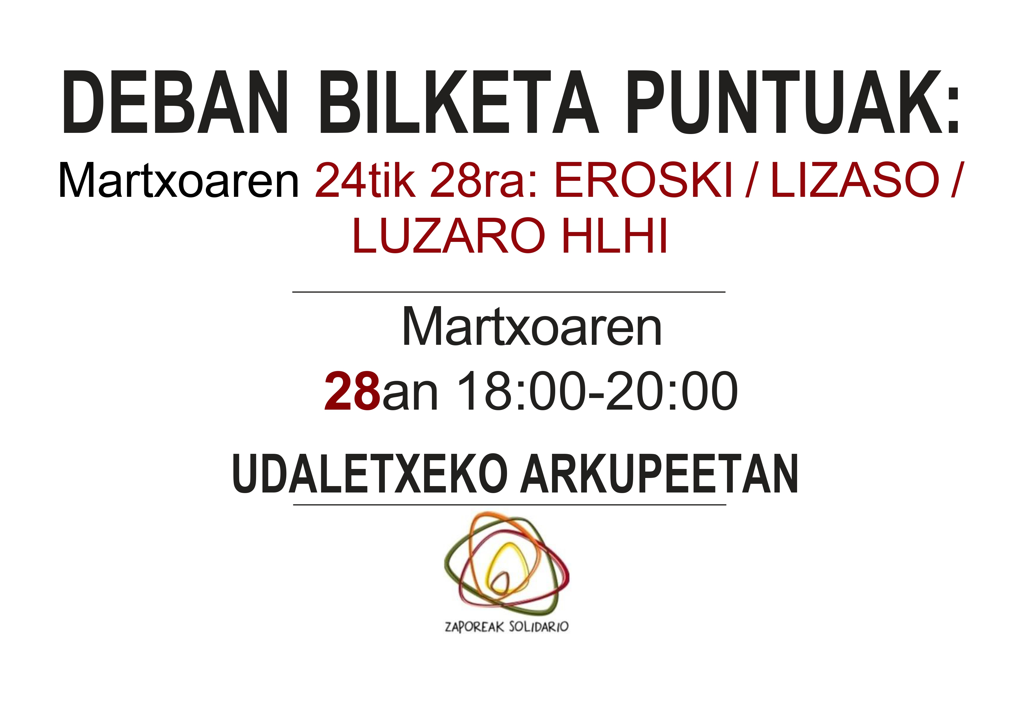 "text": " Martxoaren 24tik 28ra bitartean Zaporeak GKEak antolatutako elikagaien bilketa kanpaina egingo da Deban, "