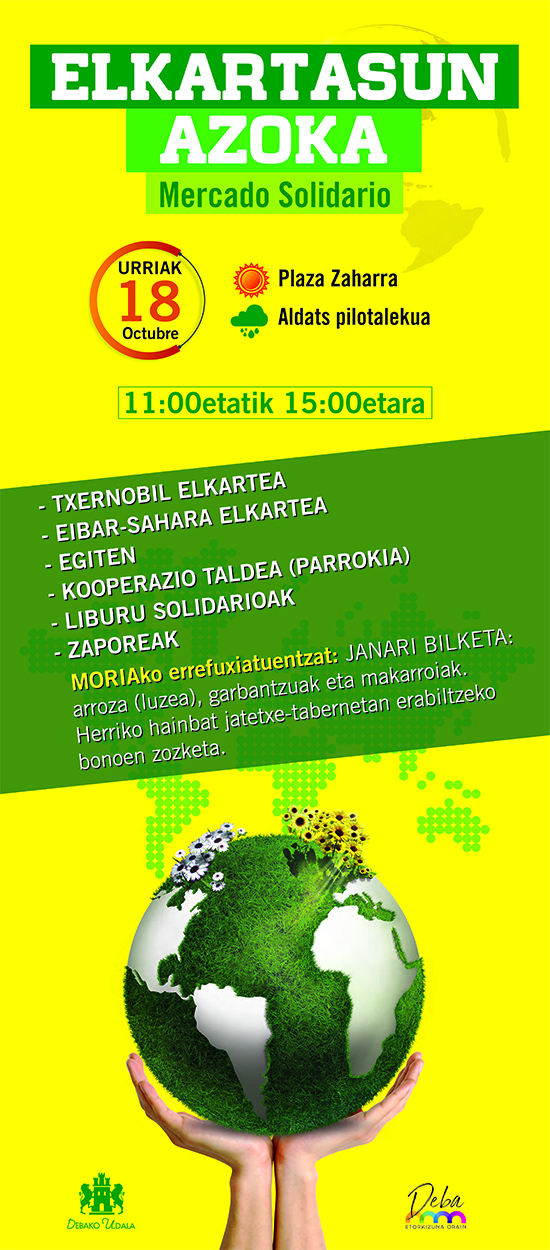 Iaz abiatutako bideari jarraituz elkartasun azoka egingo da urriaren 18an. Ateri badago, Plaza Zaharrean jarriko dira mahaiak, 11:00etatik 15:00etara. Euria egiten badu, Aldats pilotalekuan egingo da.