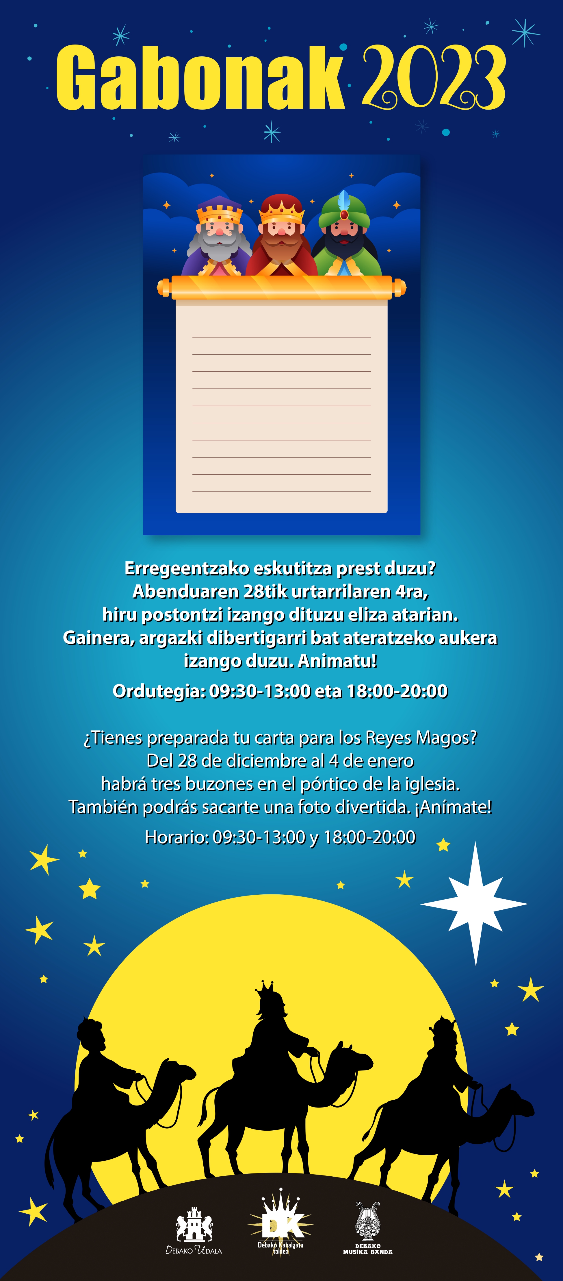 "text": "Horren harira, Eguberrietako magiari helduz, Errege Magoei zuzenduriko eskutitzak jasotzeko hiru postontzi jarriko dira elizako atarian, abenduaren 28tik urtarrilaren 4a bitartean. Horrela, Debako haurrek bertan utzi ahal izango dituzte beren desioz eta eskaerez osaturiko gutunak, Errege Magoek jaso ditzaten. Gainera argazki dibertigarri bat ateratzeko aukera ere izango dute postontzien alboan, horretarako jarriko diren apaingarriekin. "