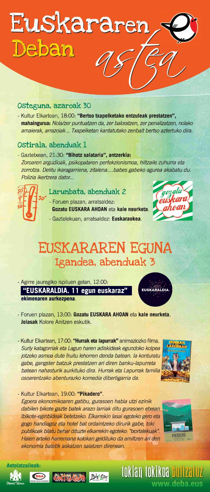 Abenduaren 3an ospatuko da Euskararen Eguna, eta Debako Udalak herriko hainbat elkarte eta eragilerekin elkarlanean askotariko ekintzak antolatu ditu.