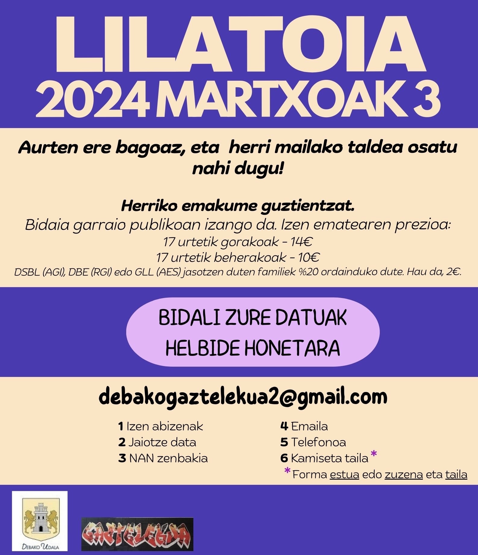 "plaintext": "Izena emateko epea zabalik dago debakogaztelekua2@gmail.com helbide elektronikora idatzita. Bertara bidali behar dira izen-abizenak, jaioteguna, NANa, posta elektronikoaren helbidea, telefono-zenbakia eta kamisetaren tailla (azken hau estua edo zuzena nahi den zehaztu behar da)."