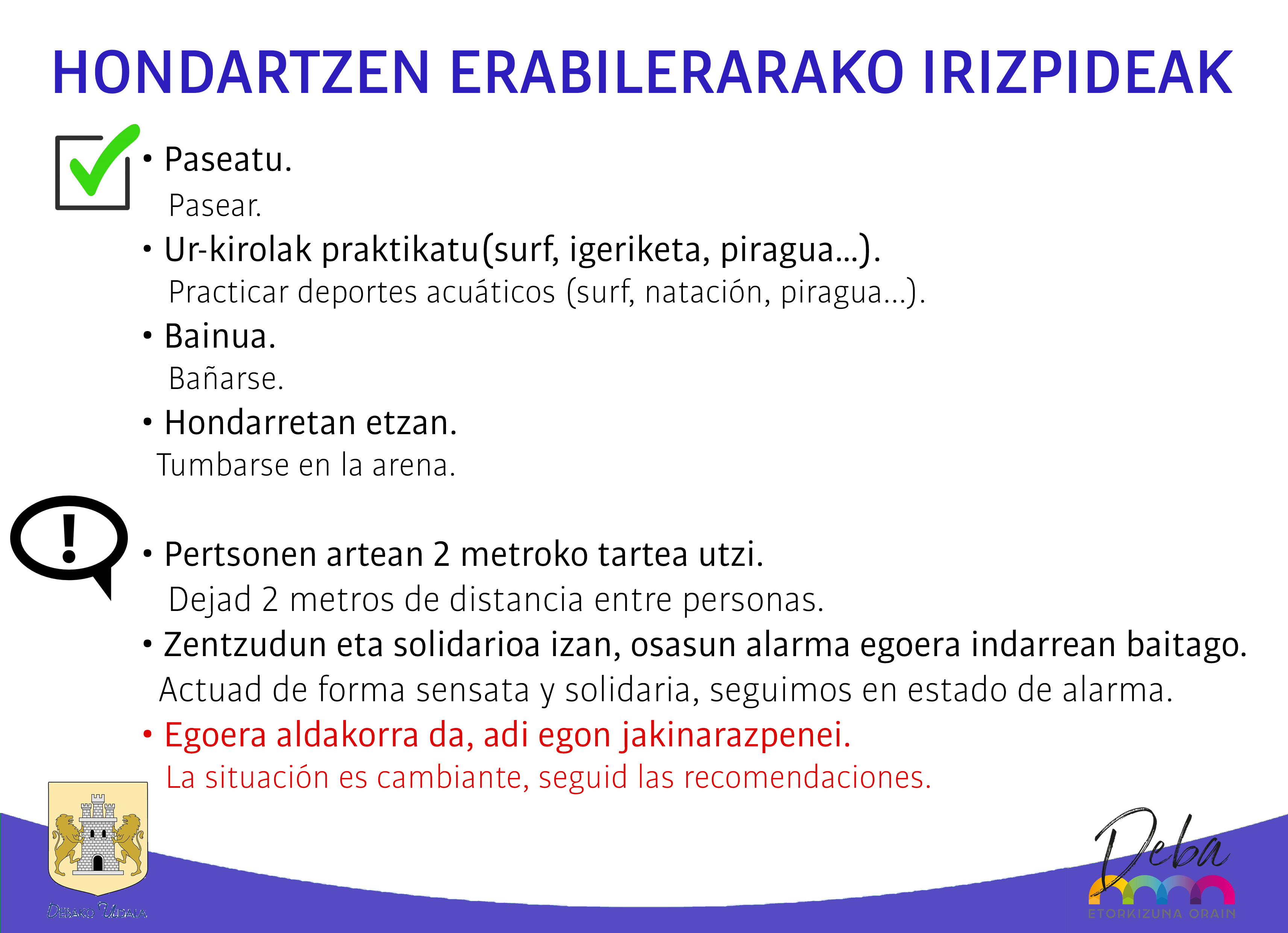 Maiatzaren 25ean sartu da Hego Euskal Herria deseskaladaren bigarren fasean. Honek, besteak beste, espazio publikoen erabileran aldaketak ekarri ditu, hondartzena, kasu. Joan den astean esan bezala, atzo (maiatzak 25) batzartu zen Gipuzkoako Foru Aldundiaren hondartzen mahaia deritzona. Debako alkateak parte hartu du bertan Debaren ordezkari gisa. Bileran, deseskaladaren fase honetan hondartzen erabilera nolakoa izango den adostu zuten eta hondartzen udako garaia hasten denean nola bermatu segurtasuna aztertzen ari dira. Aholkularitza zerbitzua jarriko du Aldundiak herri bakoitzean aforoa… nola kudeatu aztertzeko.