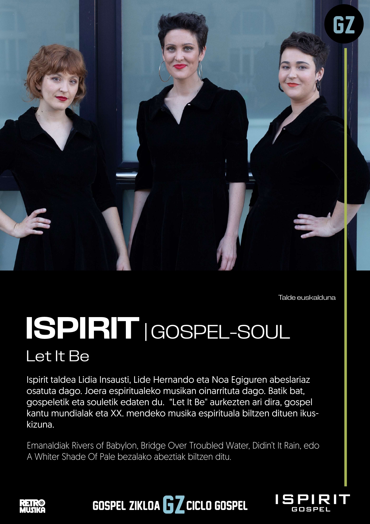 "plaintext": "Abenduaren 14an, arratsaldeko 20:00etan, Debako Santa Maria elizan \"Let It Be\" kontzertua eskainiko du ISPIRIT taldeak. Lidia Insausti, Lide Hernando eta Noa Egiguren abeslariek osatutako talde honek, gospel eta soul estiloetan oinarritutako ikuskizuna eskainiko du."