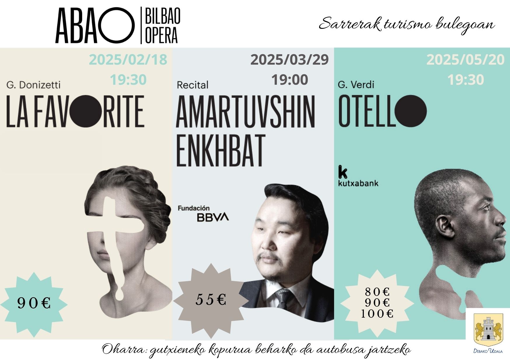 "plaintext": "La Favorite | Otsailak 18 | 19:30 | 90 \u20ac Amartuvshin Enkhbat | Martxoak 29 | 19:00 | 55 \u20ac Otello | Maiatzak 20 | 19:30 | 80 \u20ac, 90 \u20ac edo 100 \u20ac",