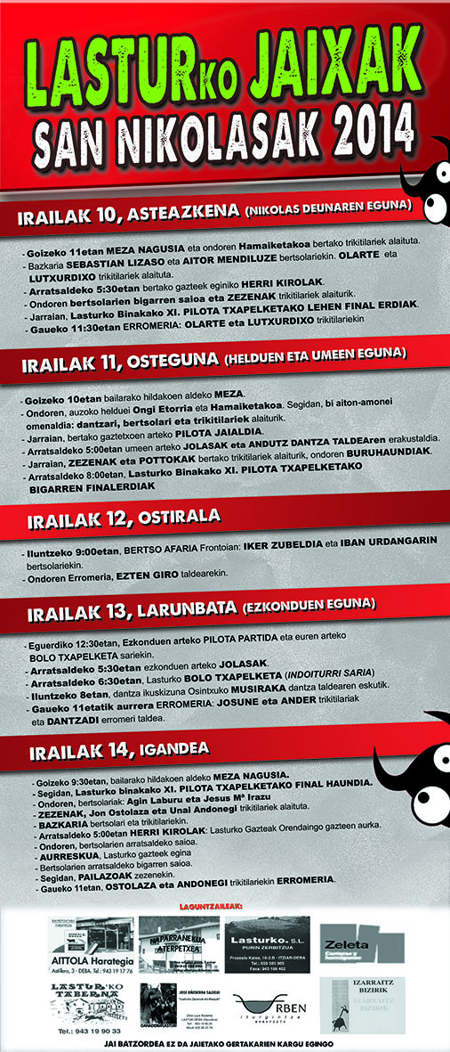 San Nikolas jaiak 2014Lasturko Jai batzordeak kaleratu berri du aurtengo San Nikolas jaiak iragartzen duen kartela. Hilaren 10ean, San Nikolas egunean hasiko dira ospakizunak eta iganderarte iraungo dute. Ohi bezala bertsolariak, herri kirolak eta dantzaldiak ez ezik lasturko zezenak ez dira falta izango. https://www.deba.eus/api/eu/aktualitatea/albisteak/san-nikolas-jaiak-2014https://www.deba.eus/api/eu/aktualitatea/albisteak/san-nikolas-jaiak-2014/@@download/image/LASTURKO JAIXAK2014.jpg