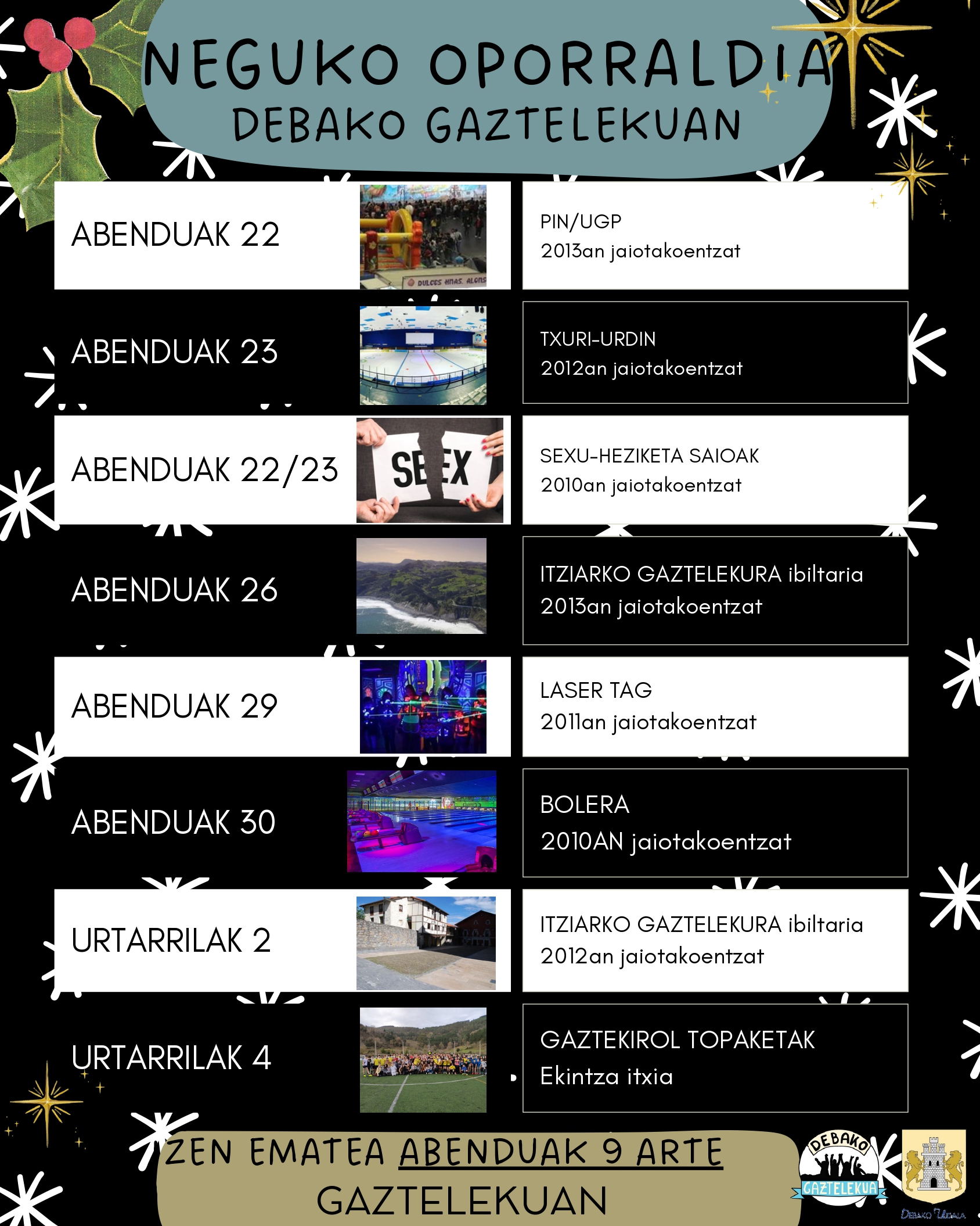 Egitarauak Euskaraokea, Lasergunea eta Bingoa jarduerak biltzen ditu, eta horrez gain adin-tarte desberdinetarako antolatutako irteerak, hala nola, PIN/UGP, Txuri-Urdinera, Laser Tag edo bolerara, neguko oporraldian parte-hartze dinamikoa eta elkarbizitza sustatzeko aukera paregabea izango dira. Jardueretan parte hartzeko izen-ematea abenduaren 9ra arte egongo da zabalik Gaztelekuan. Oporraldi garaian izango duen ordutegi bereziaren harira, Gaztelekua egunero irekita egongo da 17:00etatik 20:00etara, eta asteburuetan 20:30ak arte; hala ere, zerbitzua itxita egongo da abenduaren 24, 25 eta 31n, eta urtarrilaren 1, 3 eta 6an.