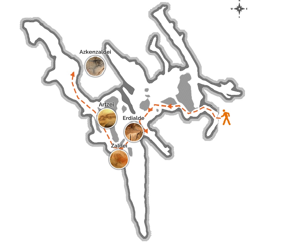 "plaintext": "Haitzuloaren sarrerak arku beheratuaren itxura du, 1,20 m garai eta 2,30 zabal oinarrian. Lehen alde estua igaro ondoren, ganga altxatu egiten da. Gune horretan, historiaurreko gizona zutitu ahal zen eta handik aurrera oinez ibil zitekeen haitzulo guztian zehar. Ondoren, estalagmitazko zorua duen galeria baten abiagunea aurkitzen dugu, gorantz, ibiltzeko erraza. Galeria hori Erdibide izendatu zuten. Abiatu eta sei metrora, haitzuloko lehen irudia ageri da, pintura beltzeko marra soil bat. Dena den, zaldi buru handi bat da lehen benetako irudia, haitzuloan den handiena. Buru handi hau haitzuloaren toki estrategikoan kokaturik dago, Erdialde salako sarreran, zaldi buruaren antza duen haitz bloke baten ikus-eremuan. Haitzuloa zaldiari eskainia dela adierazten du.",