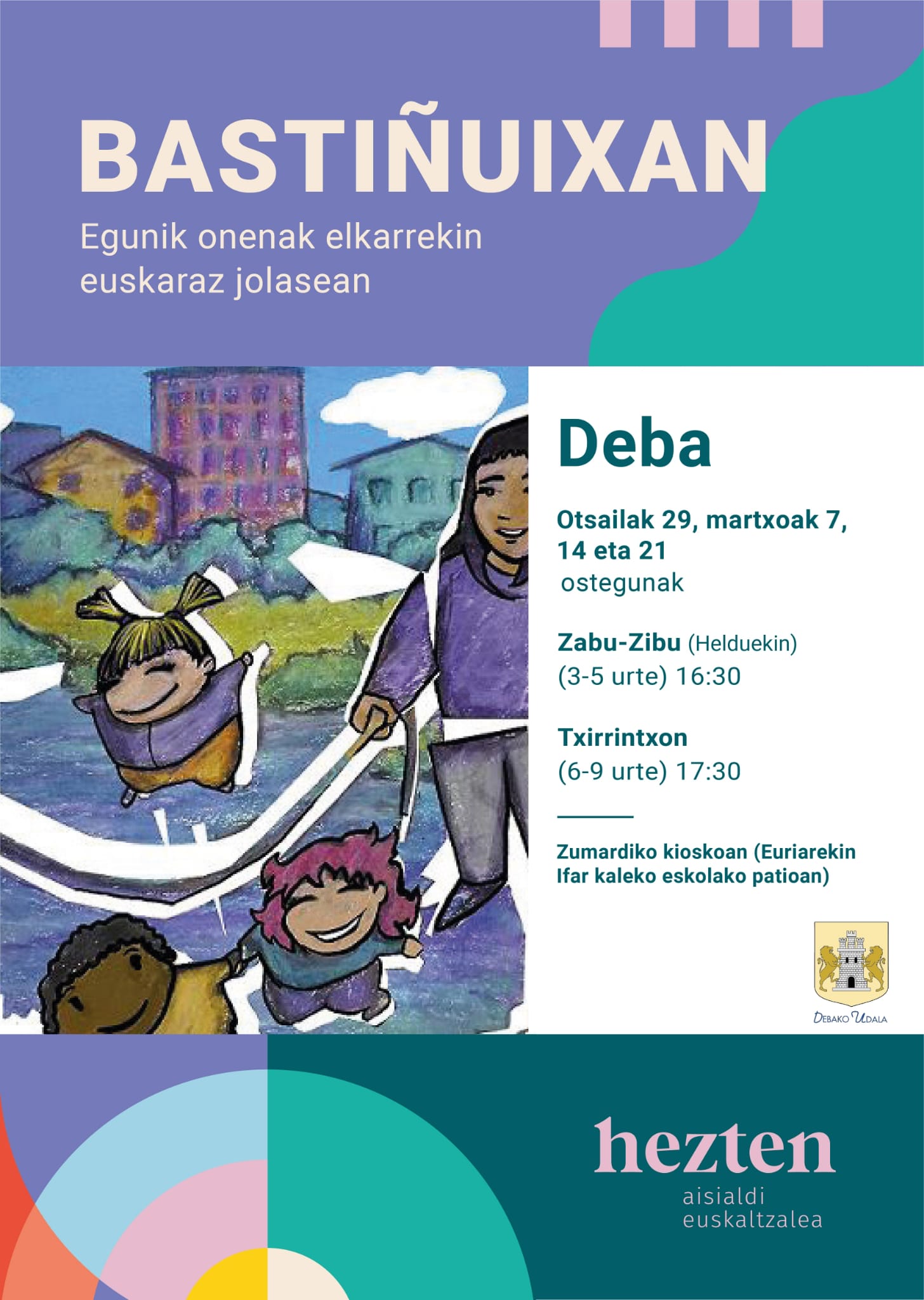 Se ofrecerán dos programas. Por un lado, Zabu Zibu (de 16:30 a 17:30 horas); para familias con niños de 3 a 5 años. El objetivo es ofrecer herramientas para poder jugar en euskera, por lo que es absolutamente necesario que los niños y niñas vayan y jueguen con algún progenitor o adulto. Por otro lado, Txirrintxon (de 17:30 a 18:30 horas); para niños y niñas de 6 a 9 años.