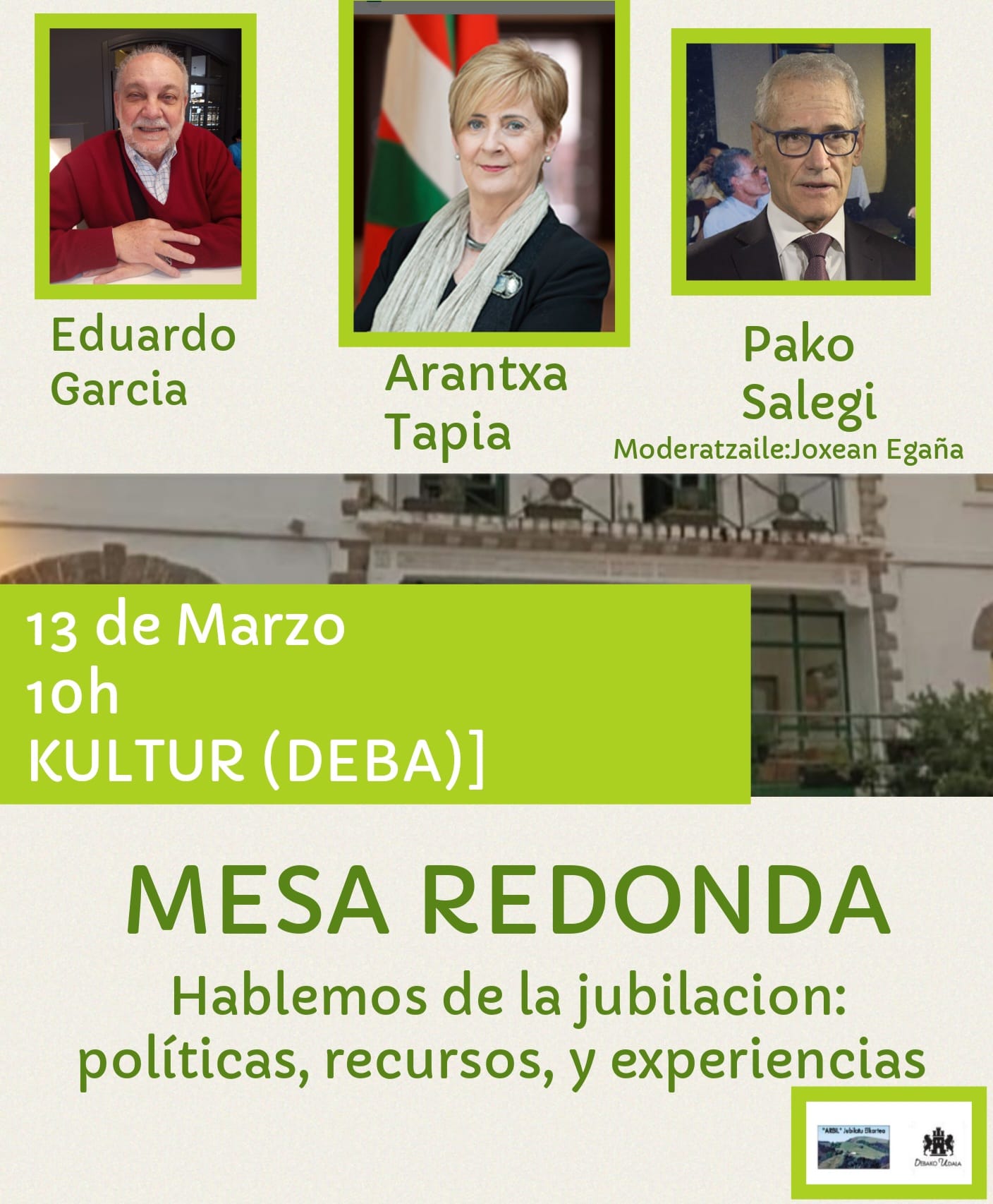 Charla informativa organizada por Arbil Elkarte Soziala en la que tmarán parte Eduardo Garcia, Arantxa Tapia y Pako Salegi.