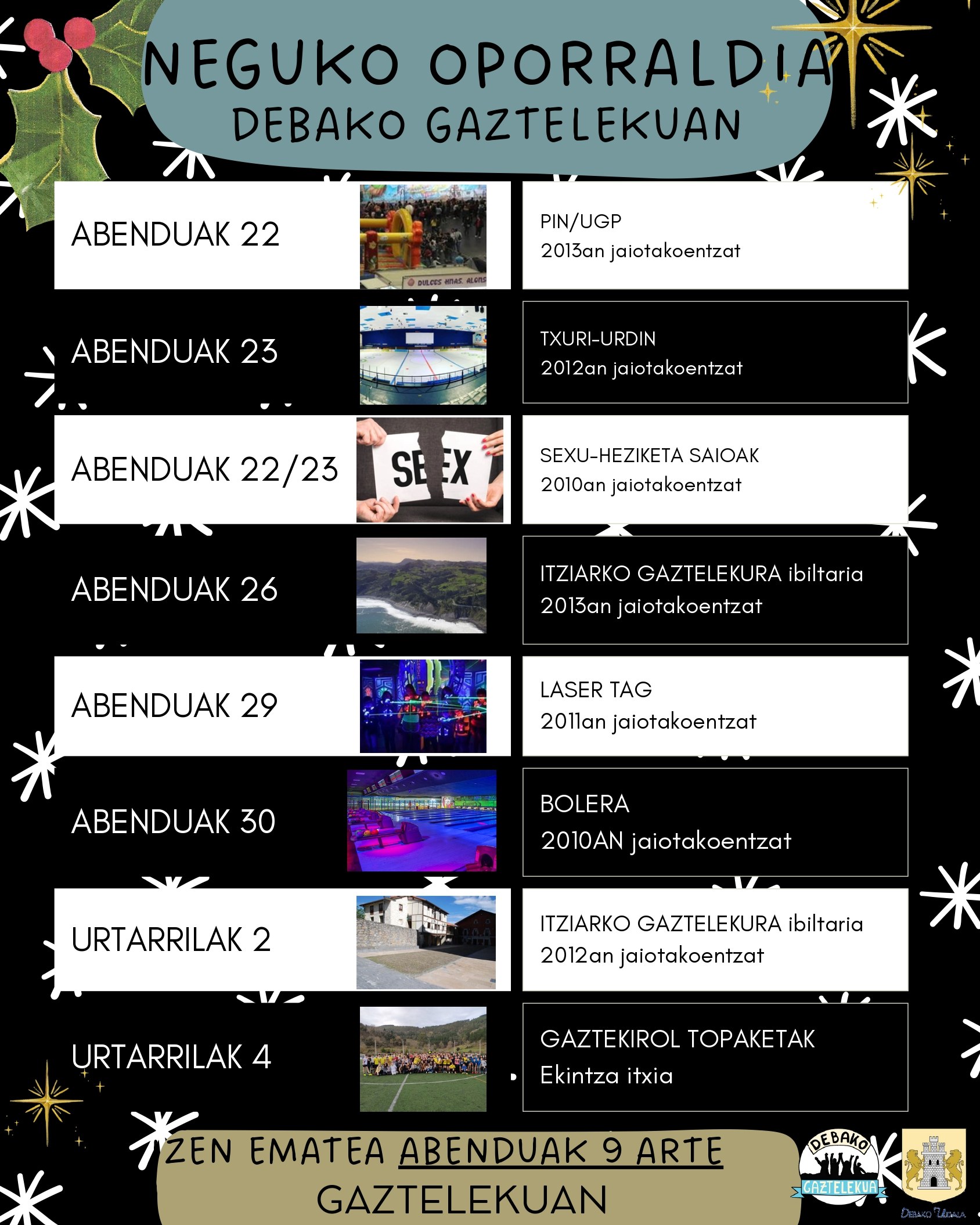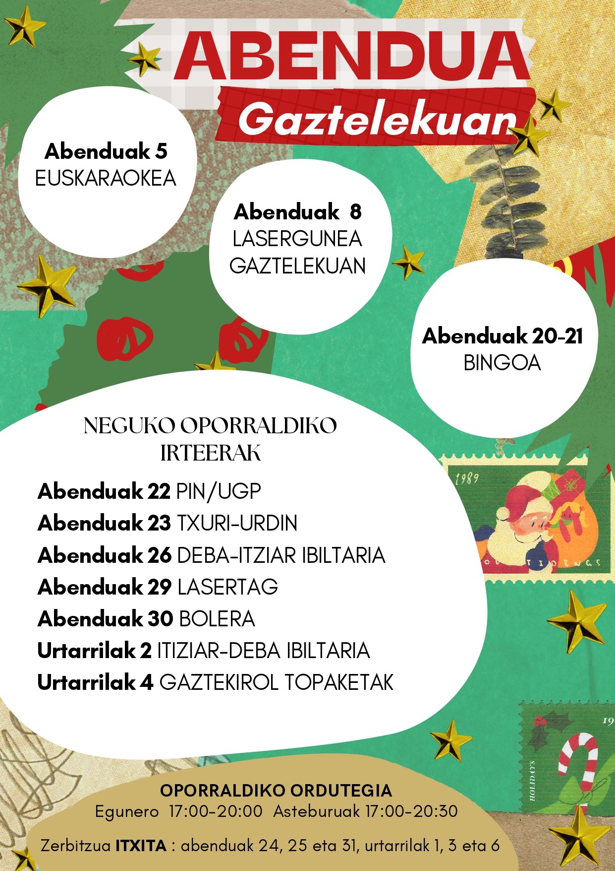 1 de diciembre de 2025El programa incluye actividades de Euskaraoke, Lasergunea y Bingo, además de salidas organizadas para diferentes franjas de edad, como el PIN/UGP, el Txuri-Urdinera, el Laser Tag o la Bolera, que serán una gran oportunidad para fomentar la participación dinámica y la convivencia en el periodo vacacional invernal. El plazo de inscripción para participar en las actividades estará abierto hasta el 9 de diciembre en el Gazteleku. Debido al horario especial de vacaciones, el Gazteleku permanecerá abierto todos los días de 17:00 a 20:00 horas y los fines de semana hasta las 20:30 horas, si bien el servicio permanecerá cerrado los días 24, 25 y 31 de diciembre y 1, 3 y 6 de enero.