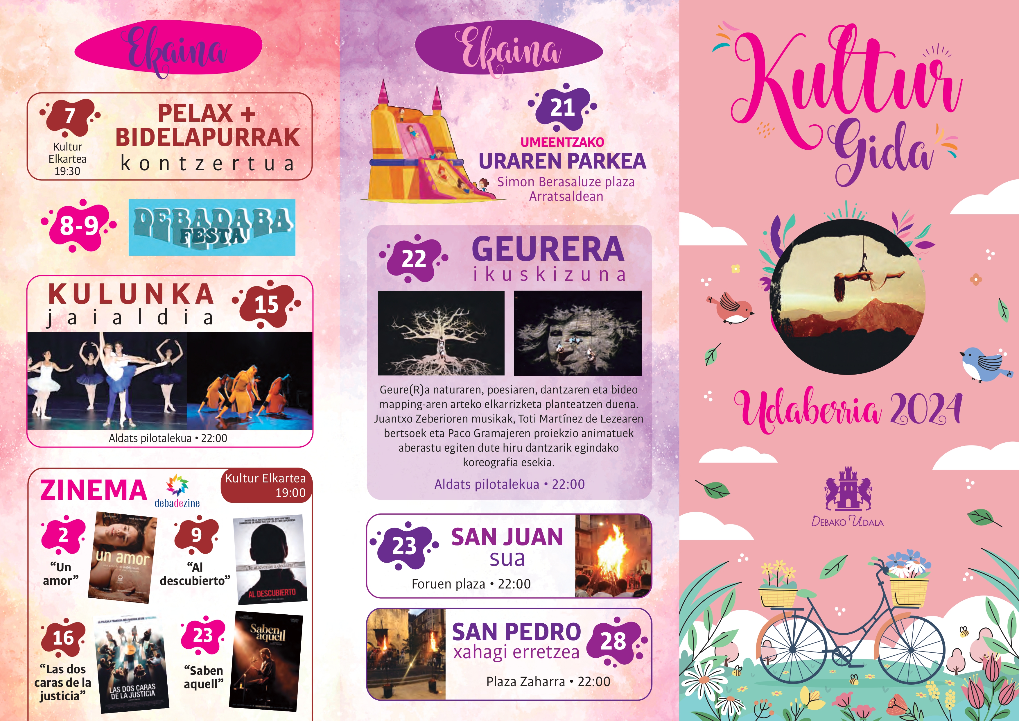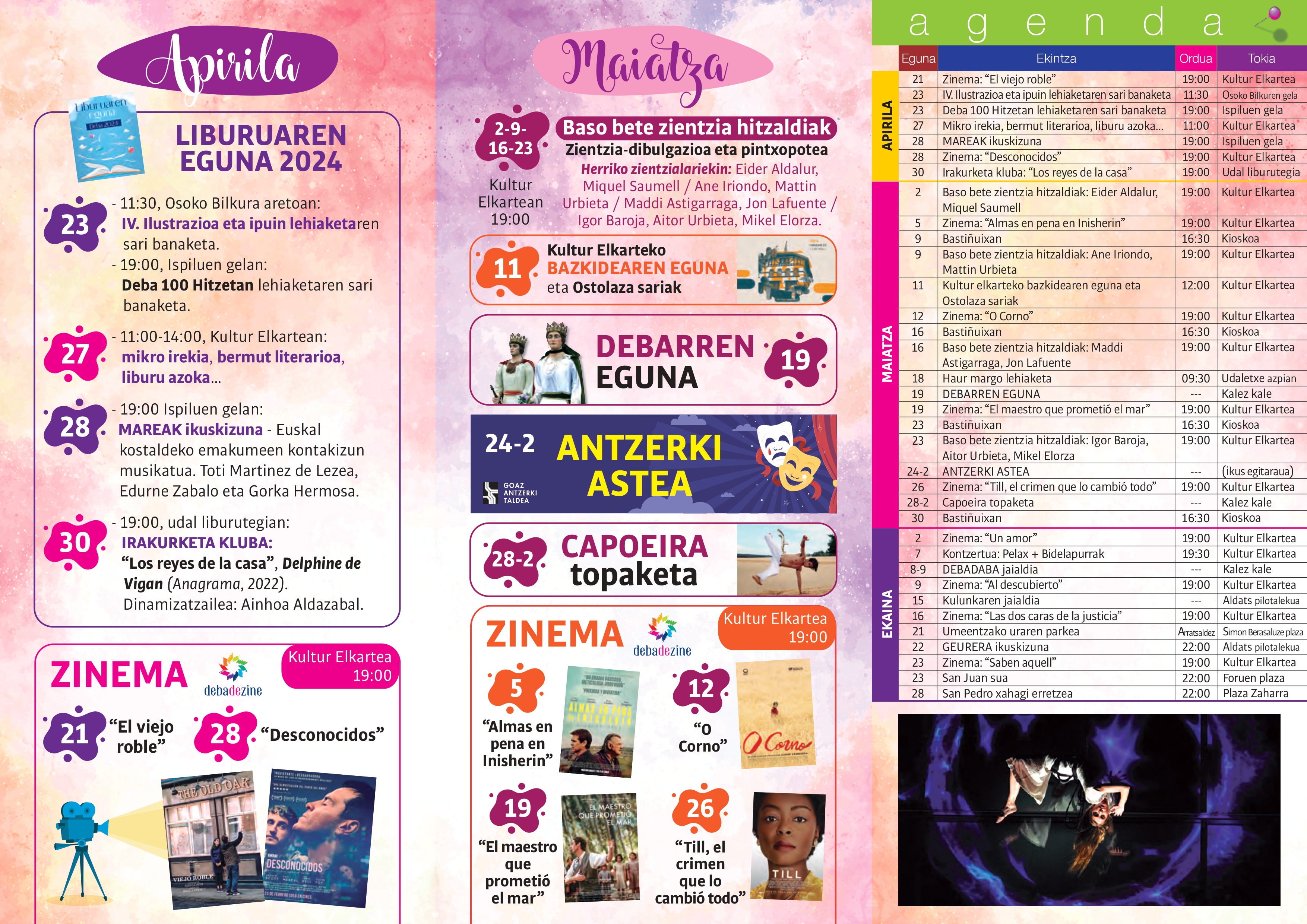 30 de abril de 2024Cine, el encuentro de capoeira, Debarren Eguna, la semana de teatro, el concurso infantil de pintura, el festival Debadaba, el parque del agua infantil, el espectáculo Geurera y otras actividades completan el programa cultural entre mayo y junio.