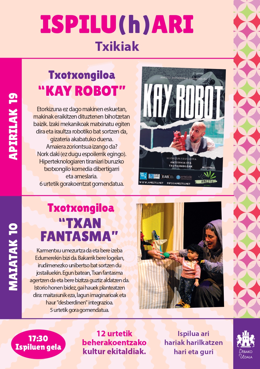 1 de abril de 2026En el caso del público adulto, a partir de 12 años, se ofrecerán la performance contemporánea “Zerbait sartu zait begian” y el concierto “Maider” de Maider Cigarroa, ambos a las 18:00 horas en Ispiluen Gela. Por su parte, para niñas y niños menores de 12 años se han programado espectáculos de títeres como “Kay Robot” y “Txan Fantasma”, que tendrán lugar a las 17:30 horas en el mismo espacio.