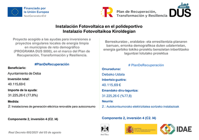 El Ayuntamiento de Deba cuenta con una nueva instalación fotovoltaica que genera energía eléctrica renovable para el autoconsumo colectivo en varios edificios municipales dentro del programa DUS 5000 (Ayudas para inversiones a proyectos singulares locales de energía limpia en municipios de reto demográfico) y con el apoyo en la justificación gestionado por el instituto para la diversificación y el ahorro de la energía (IDAE). Proyecto cofinanciado hasta en un 85% por la Unión Europea (Next Generation EU), en el marco del Plan de Recuperación, Transformación y Resiliencia.