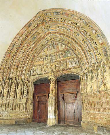 El primer cuerpo muestra, a un lado, un relieve de la Inmaculada rodeada de una banda de rayos; y al otro, la Natividad de María. En el segundo cuerpo están representadas la Anunciación, la Asunción y la Visitación. El tercer cuerpo está dedicado a la Huída a Egipto, la Coronación y la Virgen sedente presentando al Niño. Separando las tres calles, se encuentran las esculturas de San Pedro y San Pablo, San Ignacio y San Roque, y Santo Domingo y San Francisco.