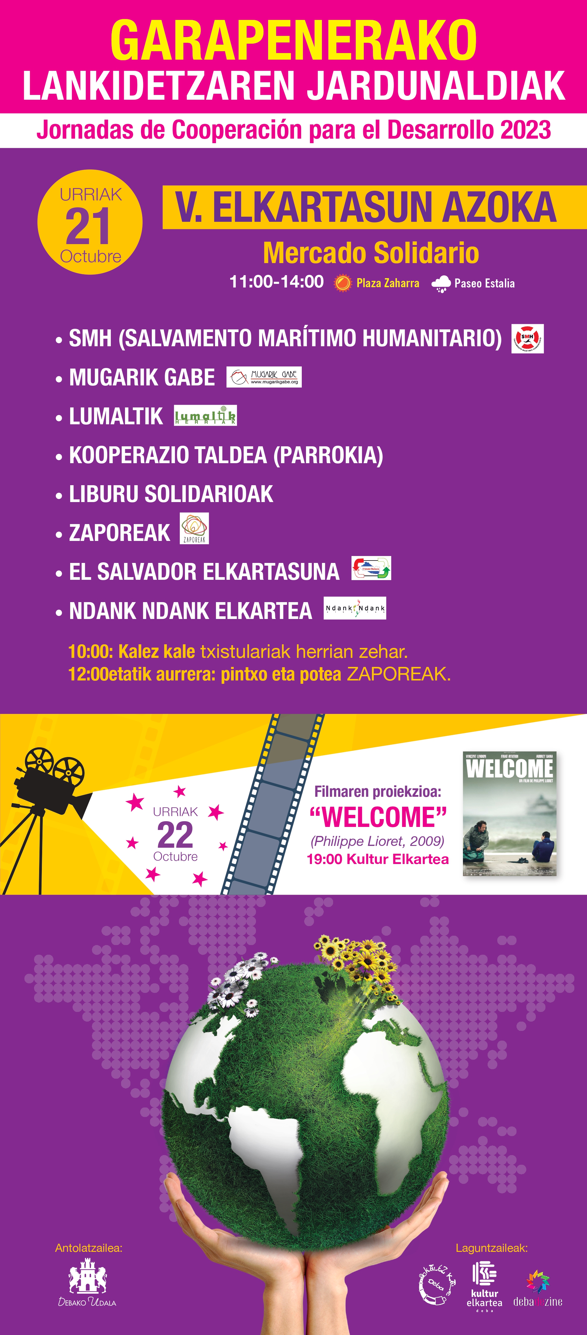 2023ko urriaren 19aUrriaren 21eko jarduera nagusia Elkartasun Azoka izango da. Bertan, irabazi-asmorik gabeko hainbat elkartek beren produktuak saltzeaz gain, dituzten helburuei eta proiektuei buruzko informazioa eskainiko dute. Igandean ‘Welcome’ filma proiektatuko da.