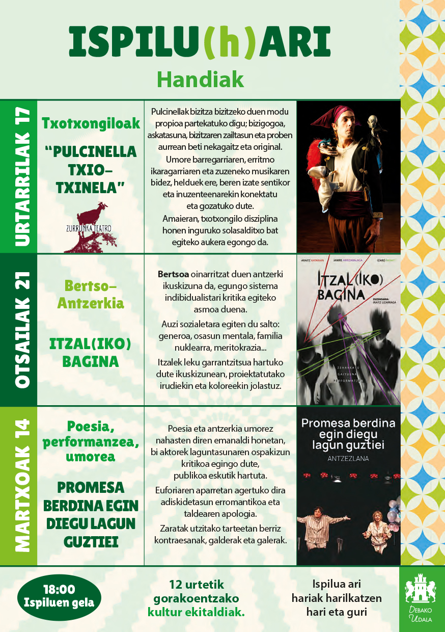 Debako Udalak herritarrei kultur programazio honetara hurbiltzeko gonbita luzatzen zaie, antzerkiaz, musikaz eta poesiaz gozatzera.