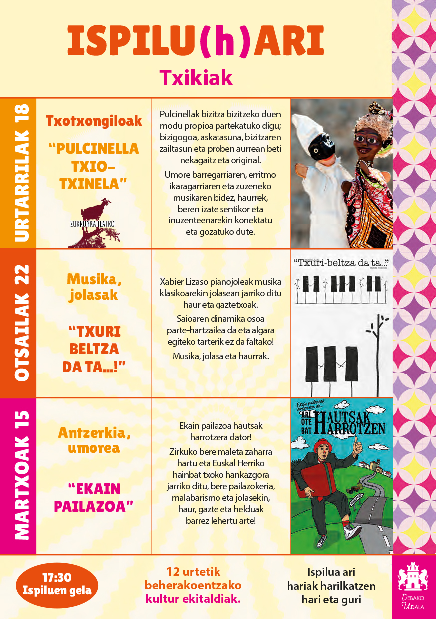 Zikloa urtarrilaren 17an hasiko da, Zurrunka Teatroren "Pulcinella Txio-Txinela" txotxongilo ikuskizunarekin. Umorez eta erritmoz betetako pieza honek bizitzeko moduari buruz hausnartzera gonbidatzen du ikuslez, askatasuna, sormena eta benetakotasuna defendatuz, baita eguneroko zailtasunen aurrean ere. Zuzeneko musikaz lagunduta egongo da emanaldia eta amaieran, txotxongiloaren arteari buruzko solasaldia eskainiko da.