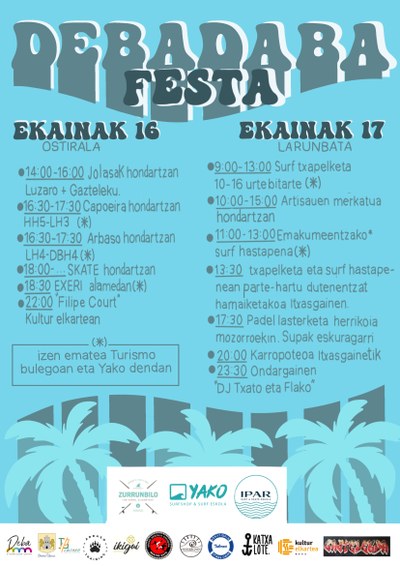 Zurrunbilo Elkarteak eta Yako eta Ipar Surf eskolek Debadaba Festa antolatu dute lehendabizikoz, Debako Udalaren laguntzarekin. Ekainaren 16an eta 17an egingo den jaialdia surfaren eta herritarren arteko topagune bihurtzea nahi dute antolatzaileek, “surfa eta kirol ezagun horren inguruko kultura herritarrei gerturatzeko asmoz”, eta horretarako, ekintzaz beteriko bi eguneko egitarau oparoa prestatu dute.